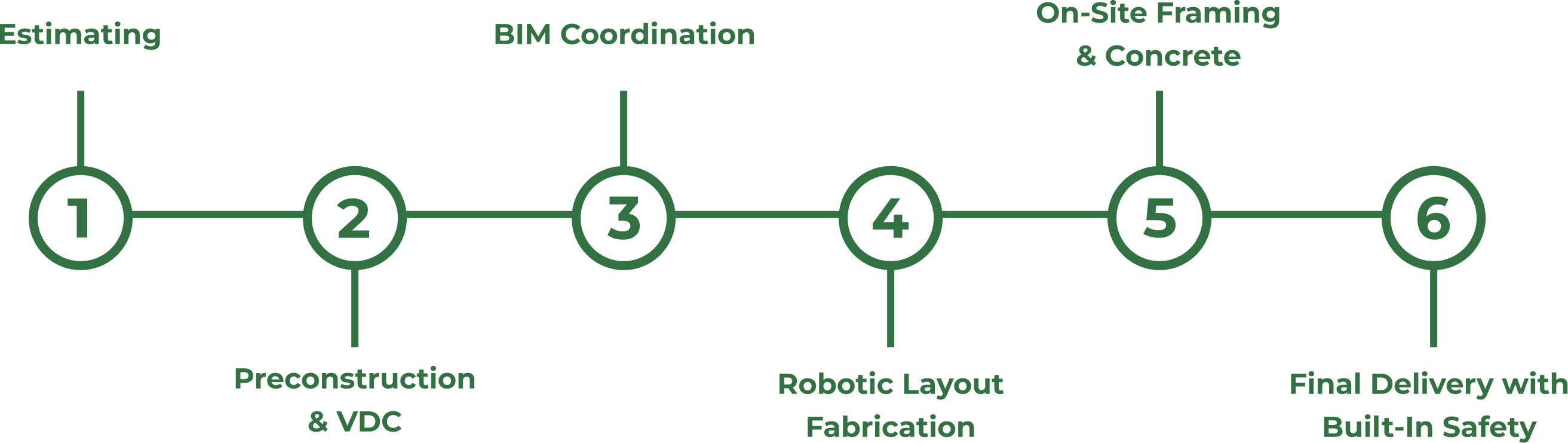 While BIM Coordination between all key trades is encouraged, every project is modeled in Revit to ensure we meet every detail and efficiency on the project. Dusty Robotics' autonomous layout robot translates BIM models directly to precise field markings, printing wall locations, panel locations, and opening dimensions directly onto the floor surface with accuracy within 1/16". This drastically reduces layout time while virtually eliminating human measurement error. Easy Frame plate layout systems similarly leverage BIM data to print exact wall detailing for top and bottom plates, ensuring perfect stud alignment and consistency across the project. By integrating these automated layout technologies with BIM workflows, EDC can achieve unprecedented speed and precision while maintaining complete digital continuity from design through construction, effectively closing the gap between virtual models and physical execution.